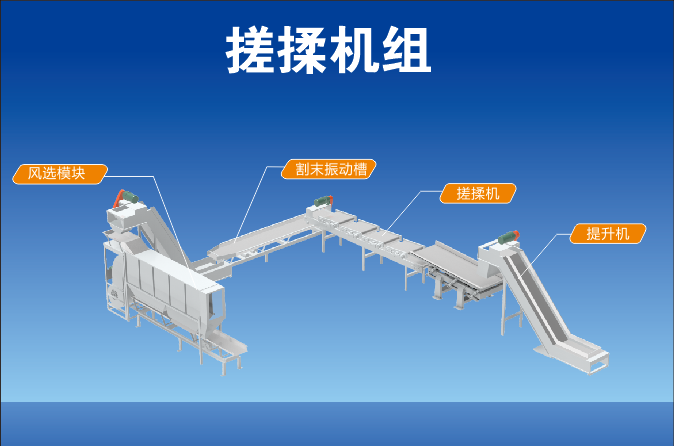 機組組成:本機組由提升機、搓揉機、割末振動槽、風選機、機組集成控制系統(tǒng)組成。