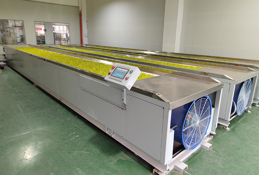 作業(yè)原理:單層式結(jié)構(gòu),機組采用的集中控制系統(tǒng)可精準控制鼓風(fēng)時間、風(fēng)量、溫度、攤?cè)~厚度/重量等主要參數(shù),實現(xiàn)攤青(萎凋)的均勻充分。 利用光電定位系統(tǒng),能有效檢測茶葉流量,可自動控制茶葉進入下一步工藝流程。